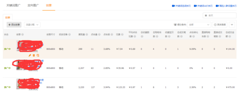 1、轮播:选择创意轮播时,系统会根据您上传的创意个数自动将流量平均分配给您上传的创意进行展现。一般轮播是在测图时使用,因为可以把不同的创意放到同一条件,同一起跑线,当展现都一样的时候,这样通过数据我们就可以选择出优秀的图片,大家在测图之前一定要多准备几组图片。